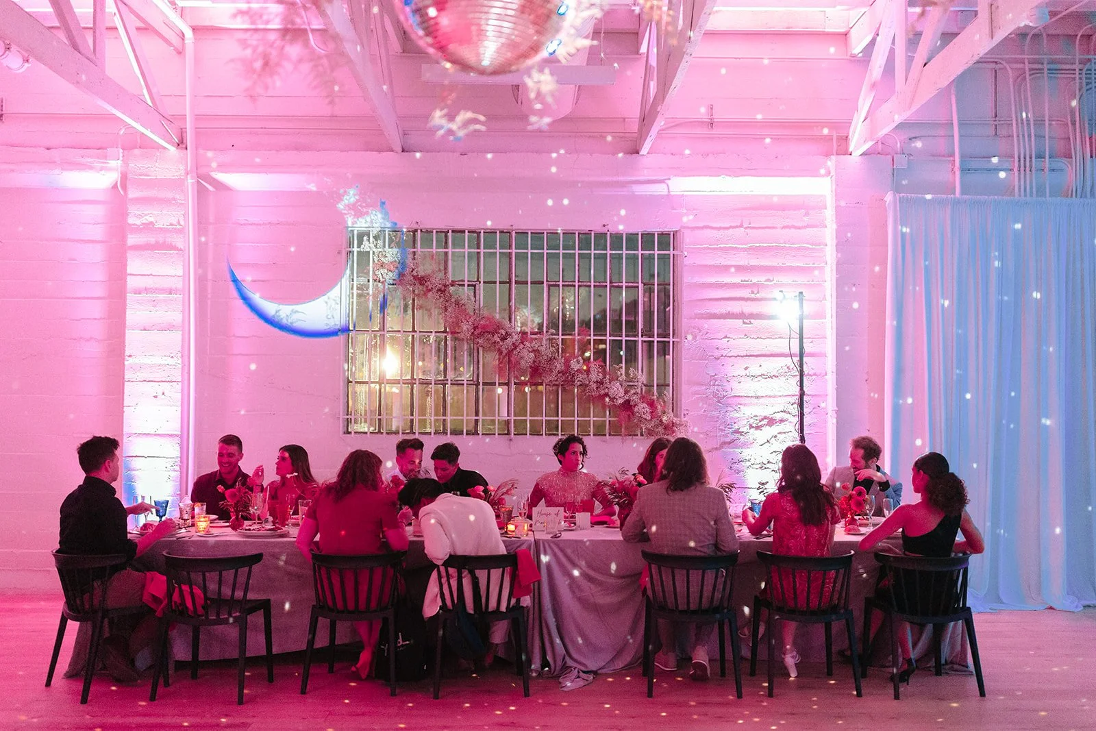 As night fell, the white warehouse space was transformed into a dazzling celebration venue. Pink uplights bathed the room in a warm, romantic glow, while clusters of disco balls illuminated the walls and ceiling, adding a touch of glamour and excitement. The evening festivities were filled with dancing, laughter, and joy, as guests celebrated the newlyweds in style.